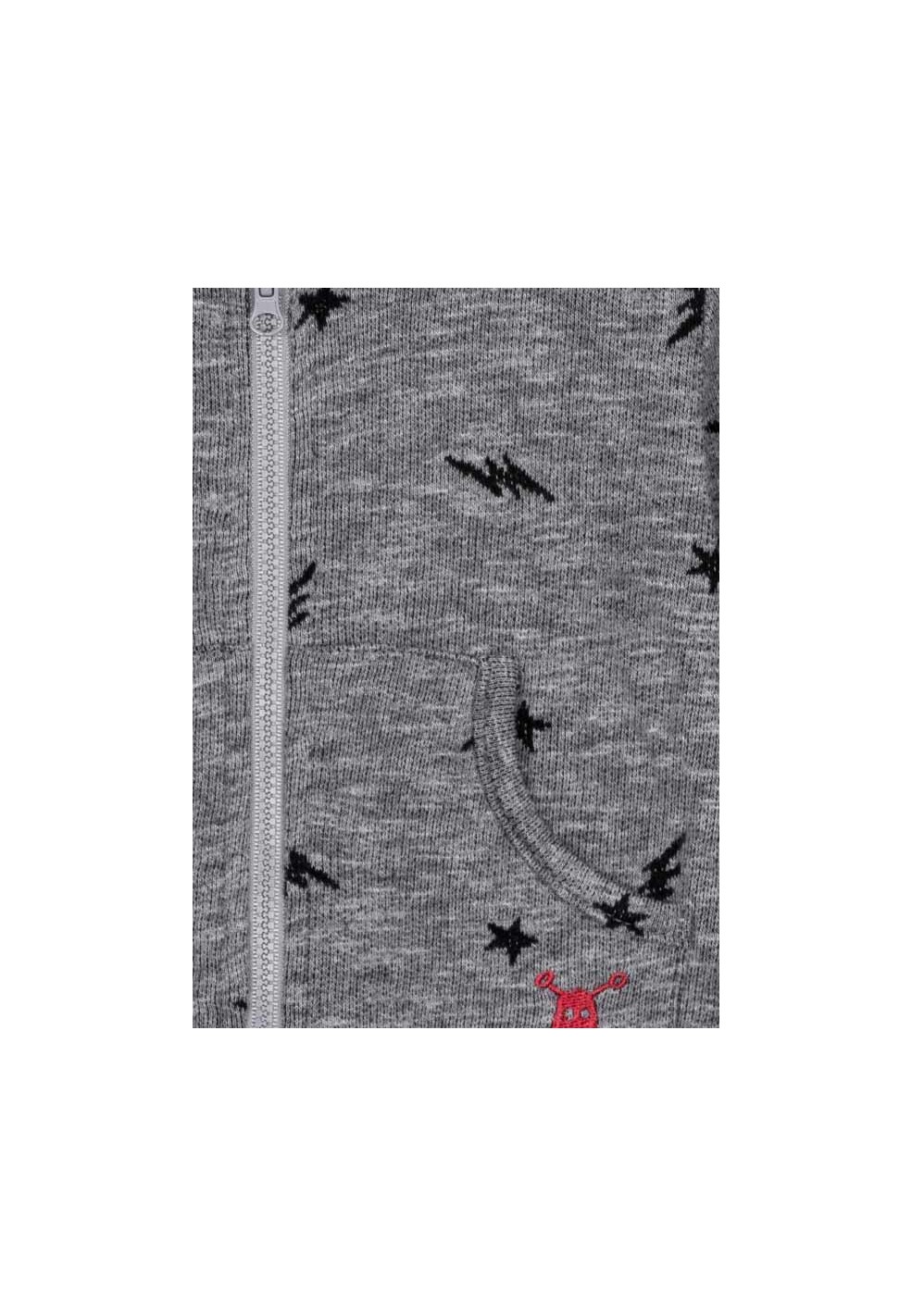 Felpina in morbido cotone garzato con zip e tasconi a marsupio. Cappuccio con fodera in pile, ricamo a contrasto di un piccolo teschio e stampe di fulmini e stelline.