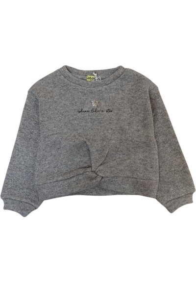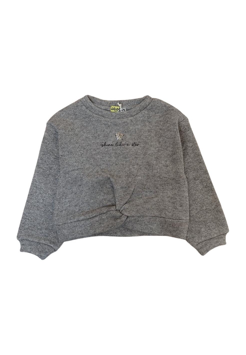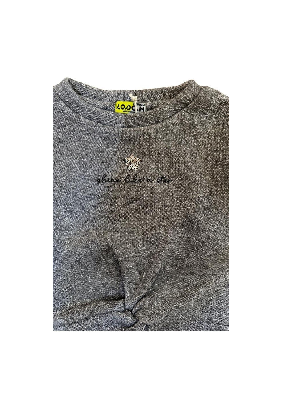Morbido Maglioncino grigio per bambina con tanti piccoli punti di metallo lucido un nodo frontale fisso una stella decorativa con scritta "shine like a star" per un look brillante e sofisticato.