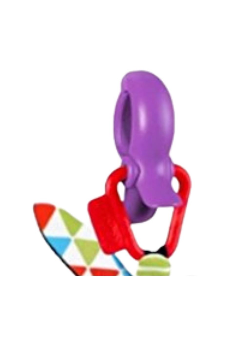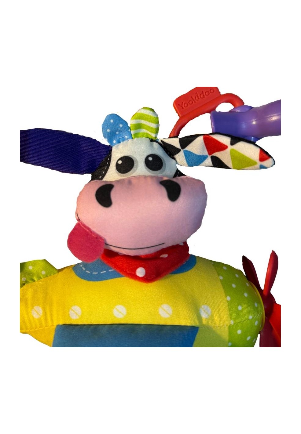 Colori vivaci, motivi geometrici e texture diverse rendono questo giocattolo un vero strumento di stimolazione sensoriale infantile. Le ali multicolori, la coda viola e il musetto da mucca con lingua rossa creano un mix visivo irresistibile. Il gancio superiore in plastica viola consente di agganciarlo facilmente a culle, passeggini, seggiolini auto o ovunque tu voglia portare il divertimento.