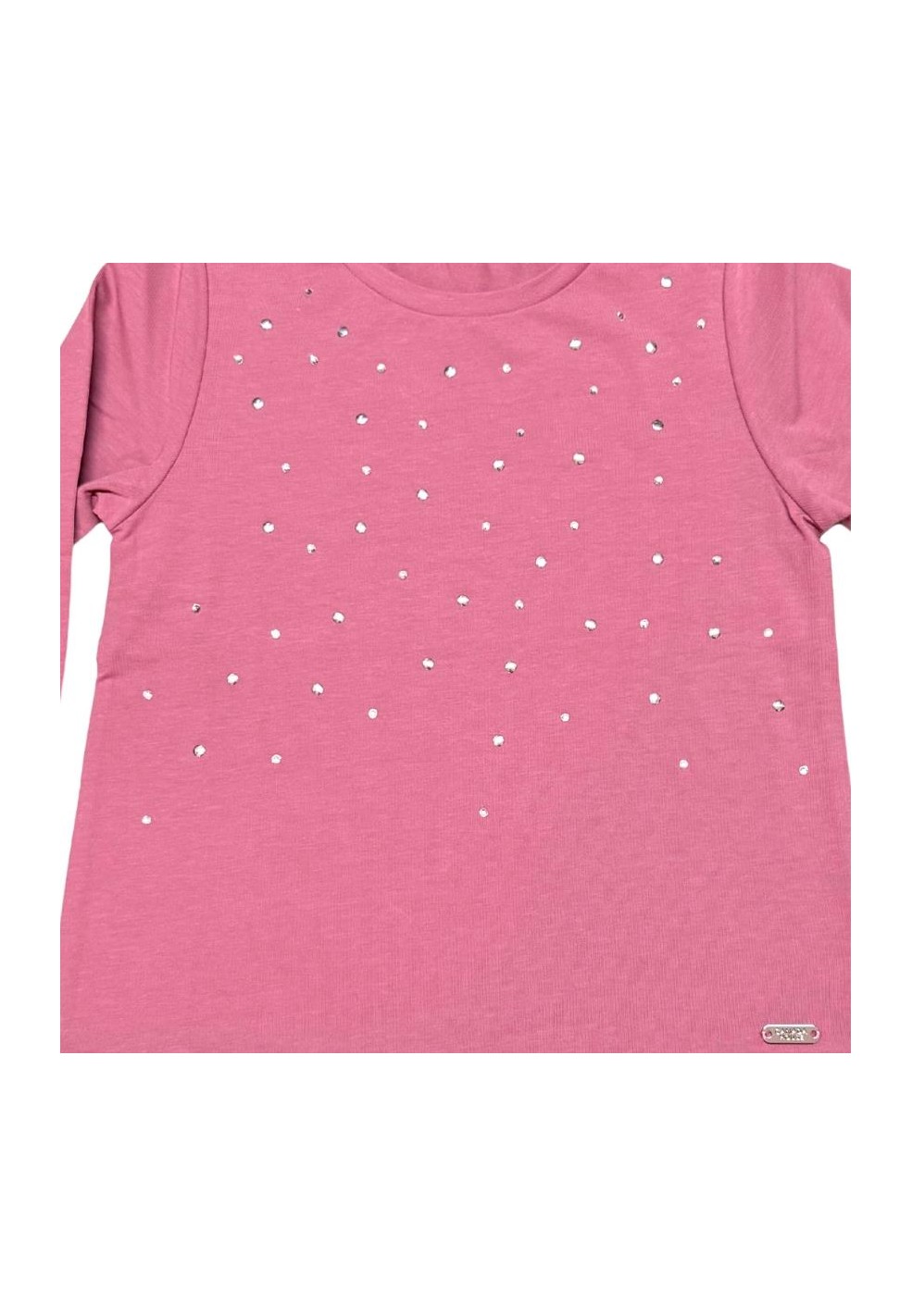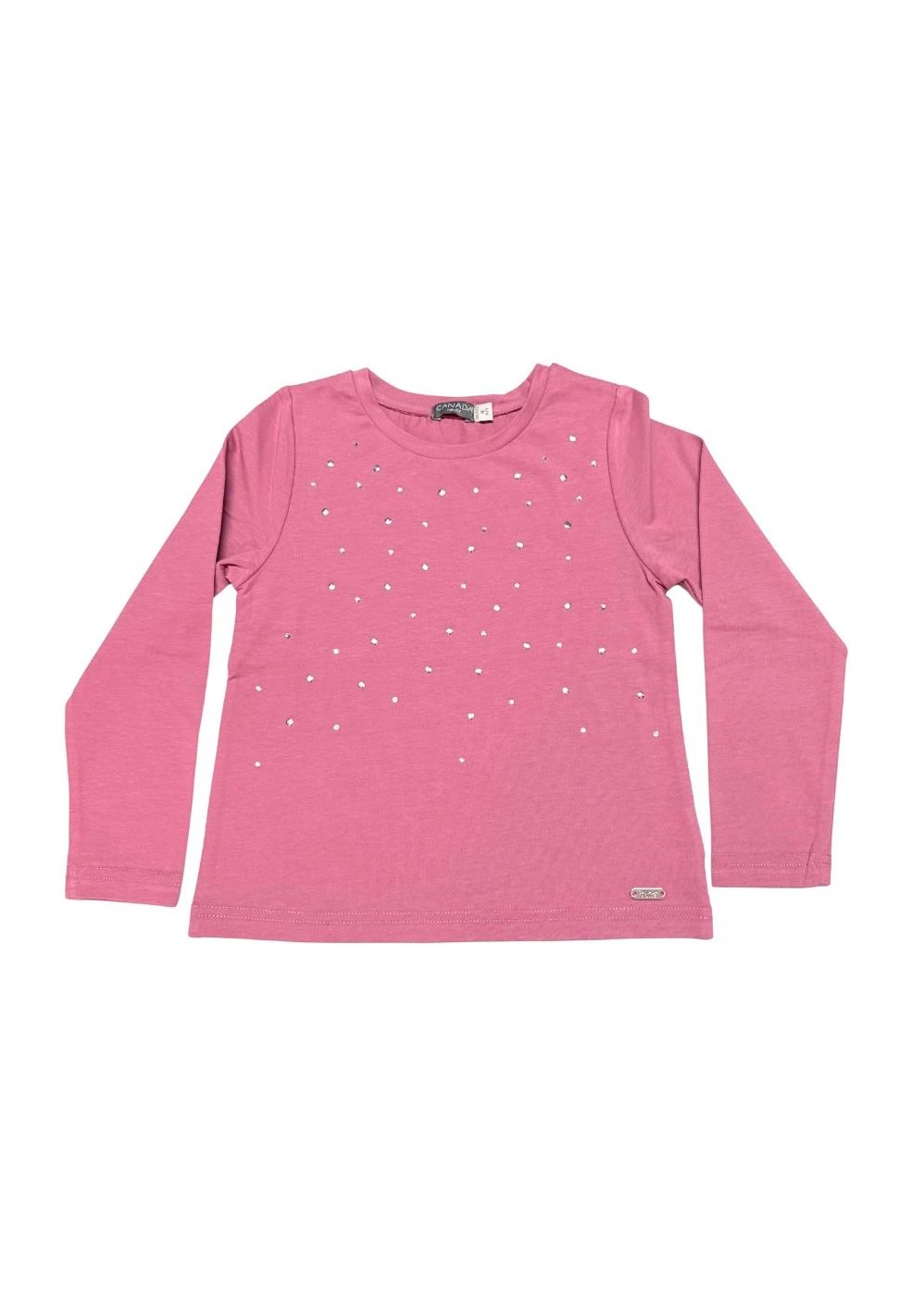 T-shirt rosa antico a manica lunga per bambina e ragazza, decorata con strass luminosi sul davanti. Un capo comodo e scintillante, perfetto per ogni occasione.