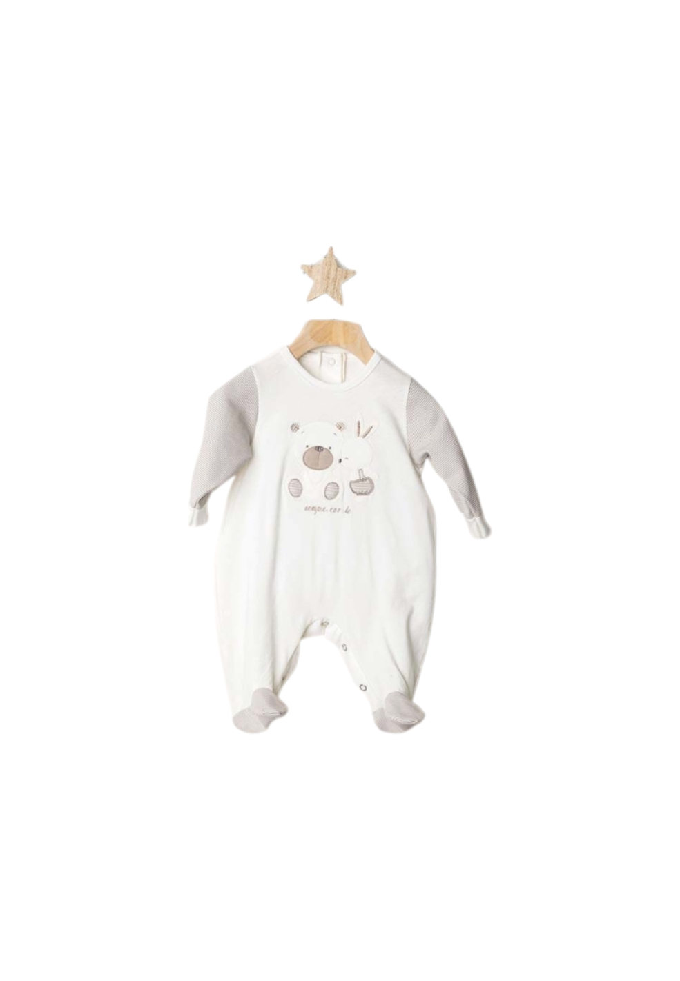 Una tutina morbidissima pensata per avvolgere il tuo piccolo in un abbraccio di comfort. Realizzata in jersey di cotone leggero e traspirante, è perfetta per le mezze stagioni e per i primi mesi di vita. Le maniche e i piedini a righe aggiungono un tocco di dolcezza, mentre il ricamo con orsacchiotto e coniglietto sul davanti racconta una piccola storia di amicizia che accompagna ogni coccola.